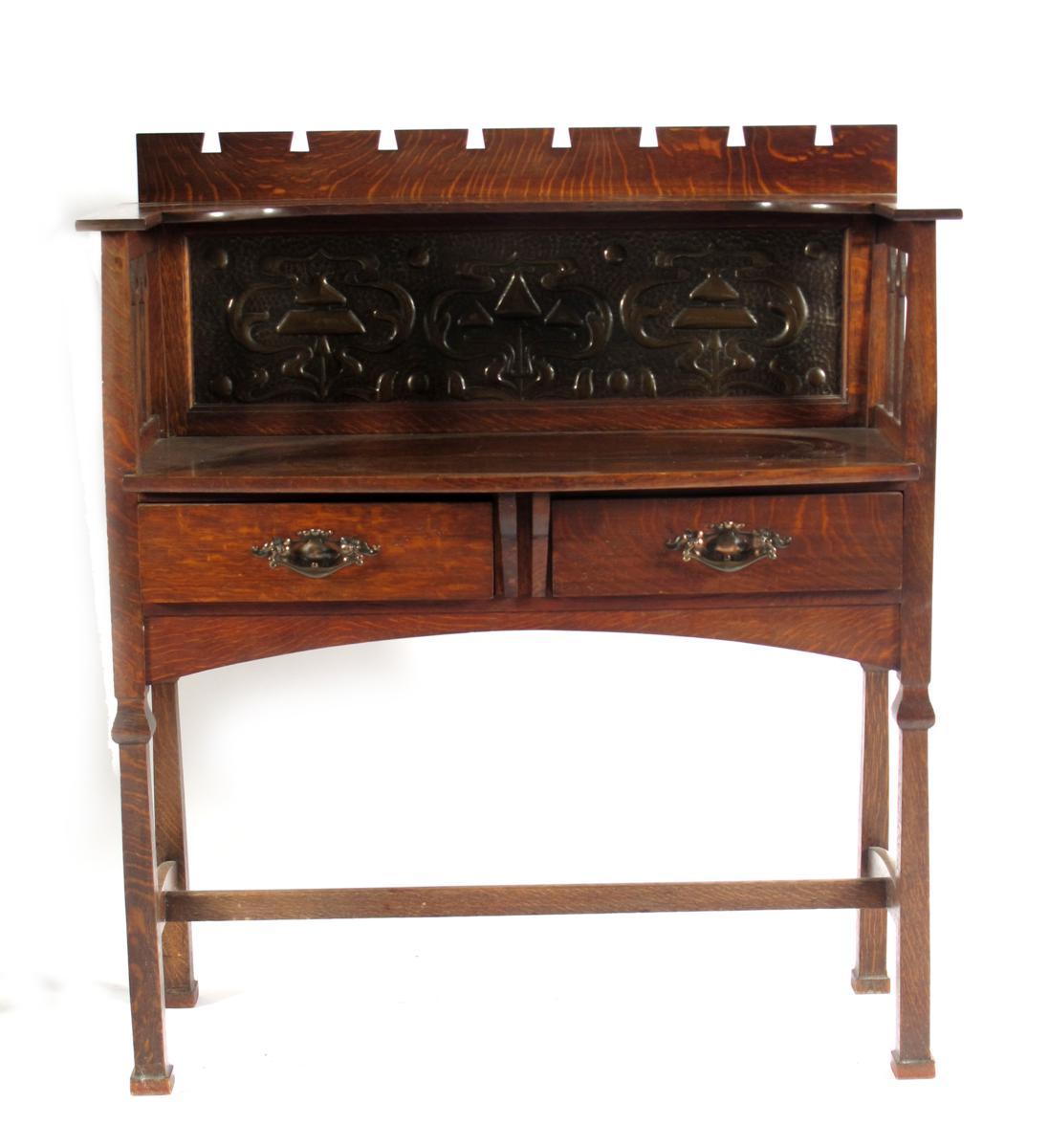 A Shapland & Petter oak hall table, model no.1407, with crenelated rail, carved and pierced heart-shaped flower fret work sides, the back applied with a patinated copper Art Nouveau foliage panel, above two drawers with patinated copper furniture impressed R 1407 86 marks to reverse 102cm. wide, 43cm. deep.