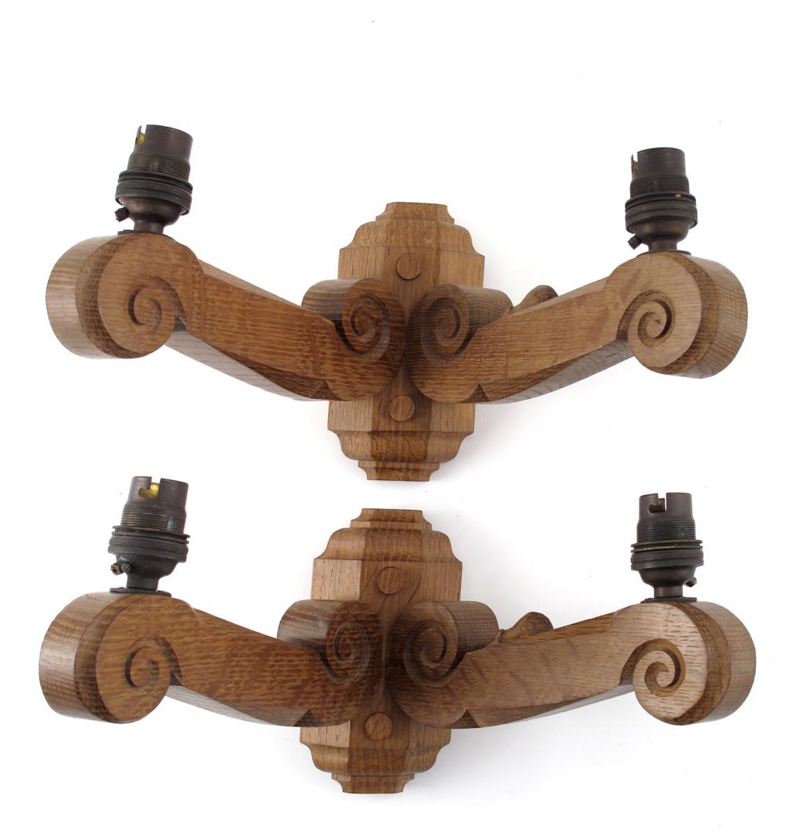 A pair of Robert 'Mouseman' Thompson oak twin-branch wall lights