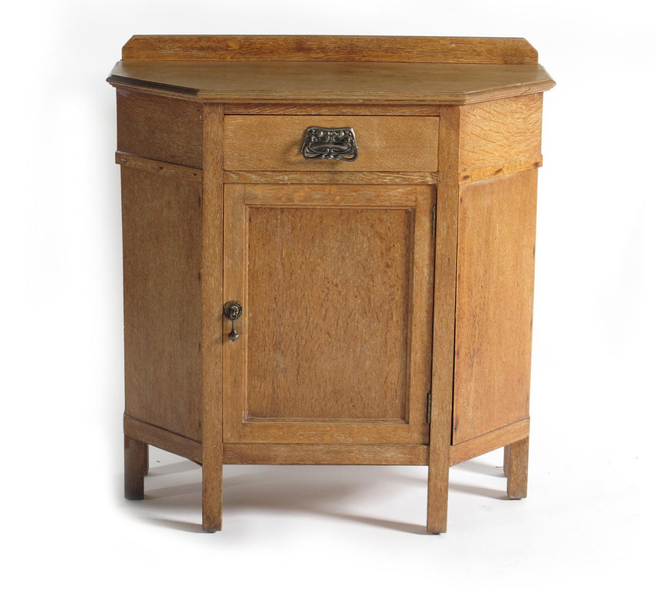 A limed oak cupboard, angled top with central drawer above hinged cupboard door, patinated metal furniture unsigned 18cm. high, 76cm. wide