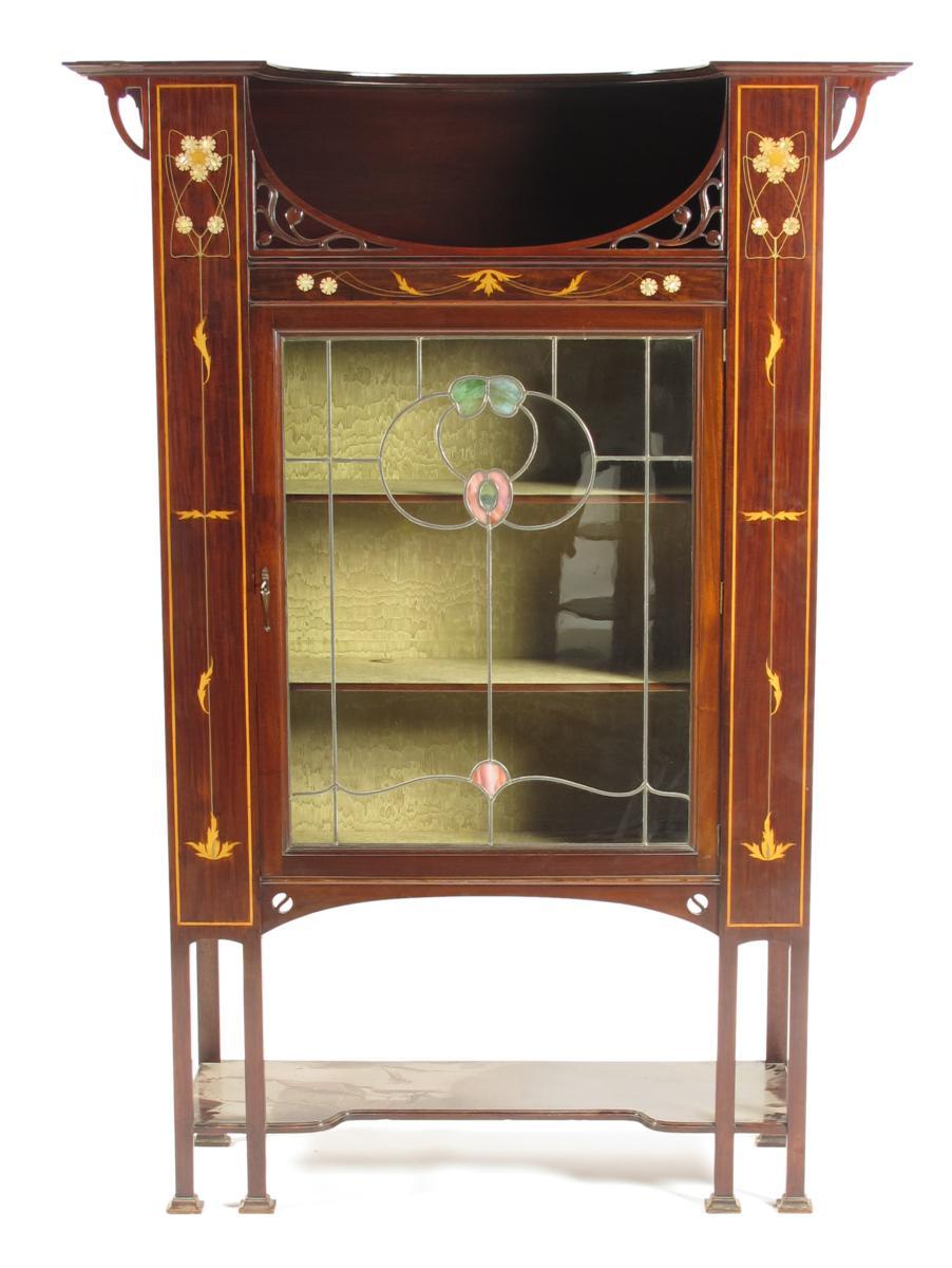 A display cabinet in the manner of Wylie & Lochhead, inlaid with mother of pearl, pewter and box wood flower stems, on six stilt legs, with leaded glass door unsigned 107cm. wide, 190cm high