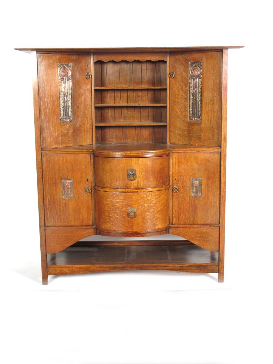 A Wylie & Lochhead oak sideboard, possibly designed by E A Taylor, canted cupboards and open shelves on bow fronted base, the doors set with enamelled metal panels, stamped Design 4765, Work NO,2805-01 152cm. wide, 167cm. high