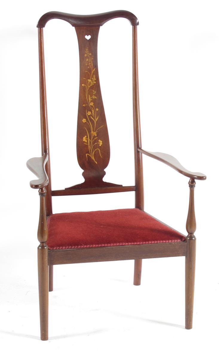 A walnut Brussels chair designed by George Walton, with pierced heart to back and inlaid marquetry flower spray unsigned, reduced legs 109cm. high Literature Karen Moon George Walton Designer and Architect, plates 94 and 137.