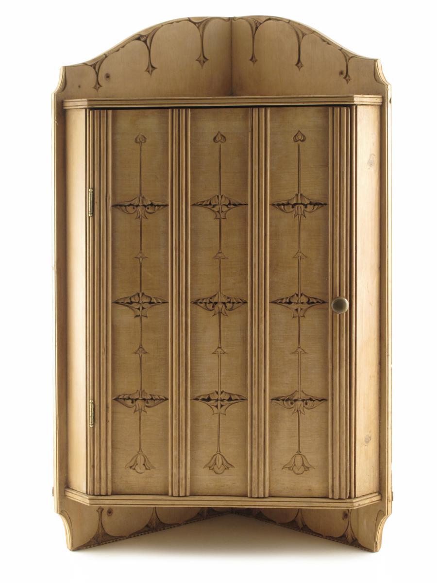 A W.A.S Benson carved pine corner cupboard, designed by W.A.S Benson, the hinged door carved with a foliate column terminating with a pendulous light, incised W.A.S. B. to the inside of the door 82cm. high