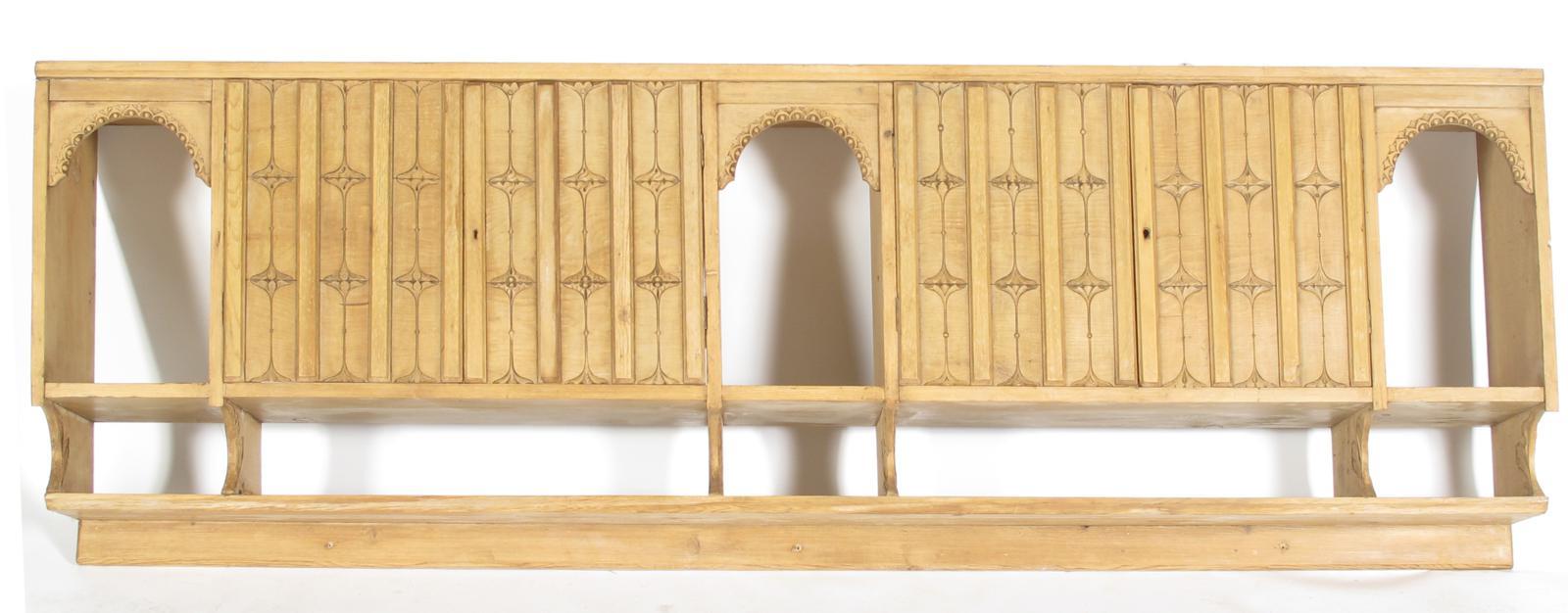 A W.A.S Benson pine carved fitted cupboard and shelf unit, designed by W.A.S Benson, with two twin-door cupboards flanked by three arched open compartments, the doors carved with Art Nouveau foliate columns, above a long shelf carved with leaf detail to the brackets, unsigned 67cm. high, 229cm. wide