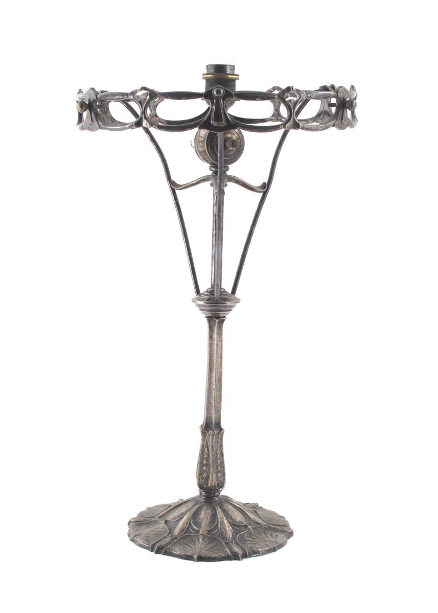 A rare W.A.S Benson patinated metal table lamp base, the base cast with foliate motif, with central fluted stem flaring to tripod support stamped mark to base rim 42cm. high