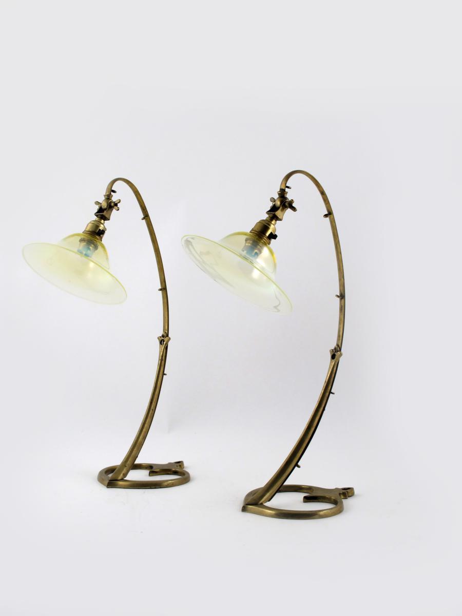 A Pair of W.A.S Benson brass table/wall lamps, slender, curved arms with adjustable light fittings, on heart-shaped base, with vaseline glass shades unsigned 46.5cm. high
