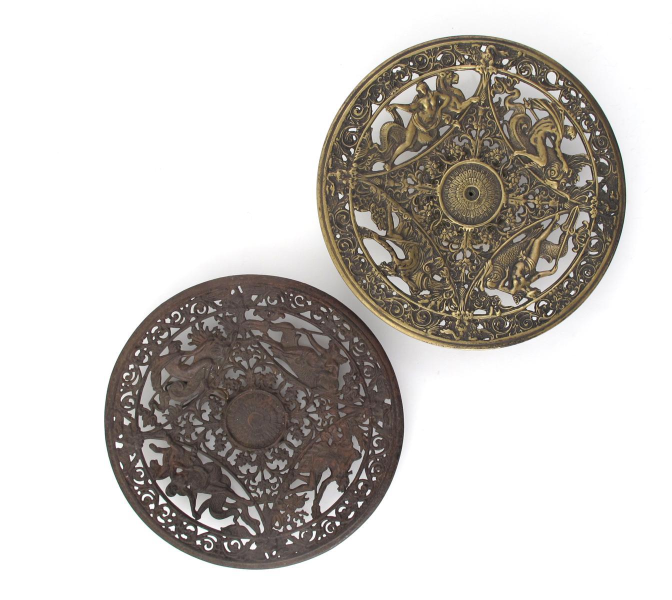 A Coalbrookdale bronze tazza, cast and pierced with classical figures riding sea beasts, amongst scrolling foliage panels, the border classical scrolling foliage, with central chrysanthemum flowerhead and another similar unsigned 22cm. diam.