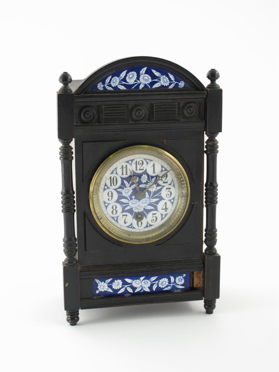 An Aesthetic Movement ebonised wood mantle clock, rectangular case set with blue and white floral enamel panels 34cm. high