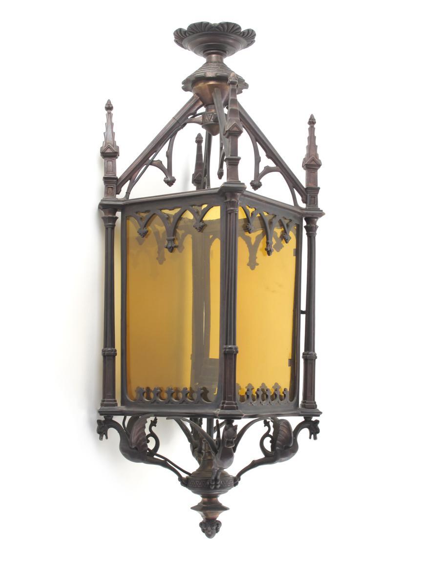 A patinated metal lantern, square section, the base cast with flying griffin creatures, Gothic tracery decoration with amber glass panels unsigned 65cm. high