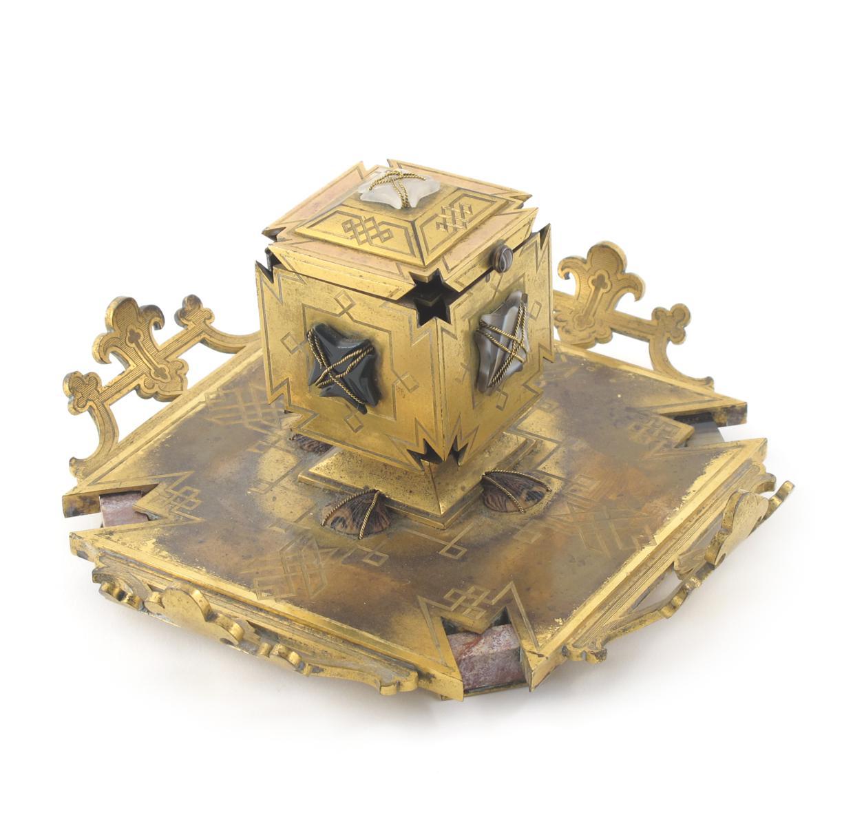 A French bronze inkwell, cruciform base with curved, pierced rim, set with central square inkwell, with engraved geometric decoration and applied with marble feet and polished stone panels, and a pair of cast metal dragon candlesticks unsigned 22cm. wide