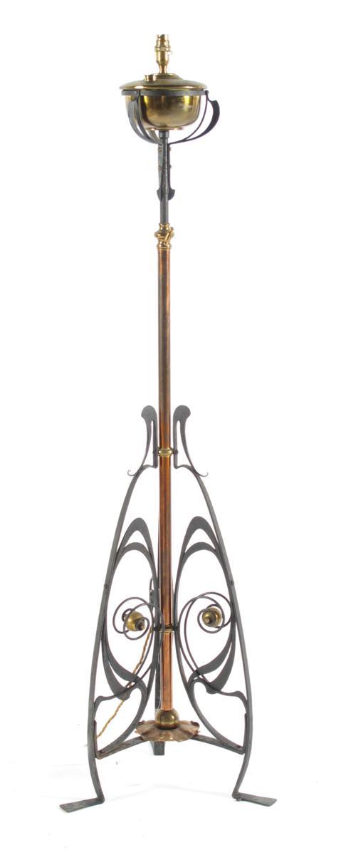 An Art Nouveau continental copper and wrought iron standard lamp, 153cm. high