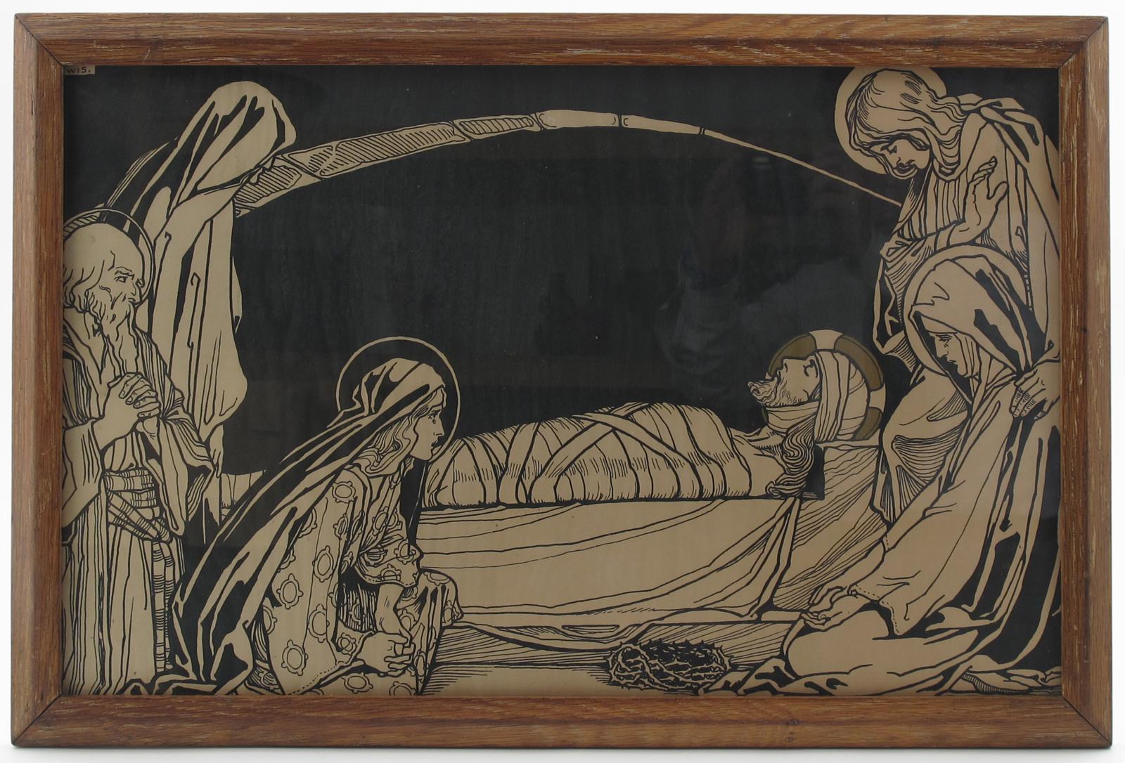 A pair of linocut prints on paper by G Hoyes-Lewis, depicting Christ carrying the cross and Christ in the tomb, framed signed in the print 61 x 38cm.