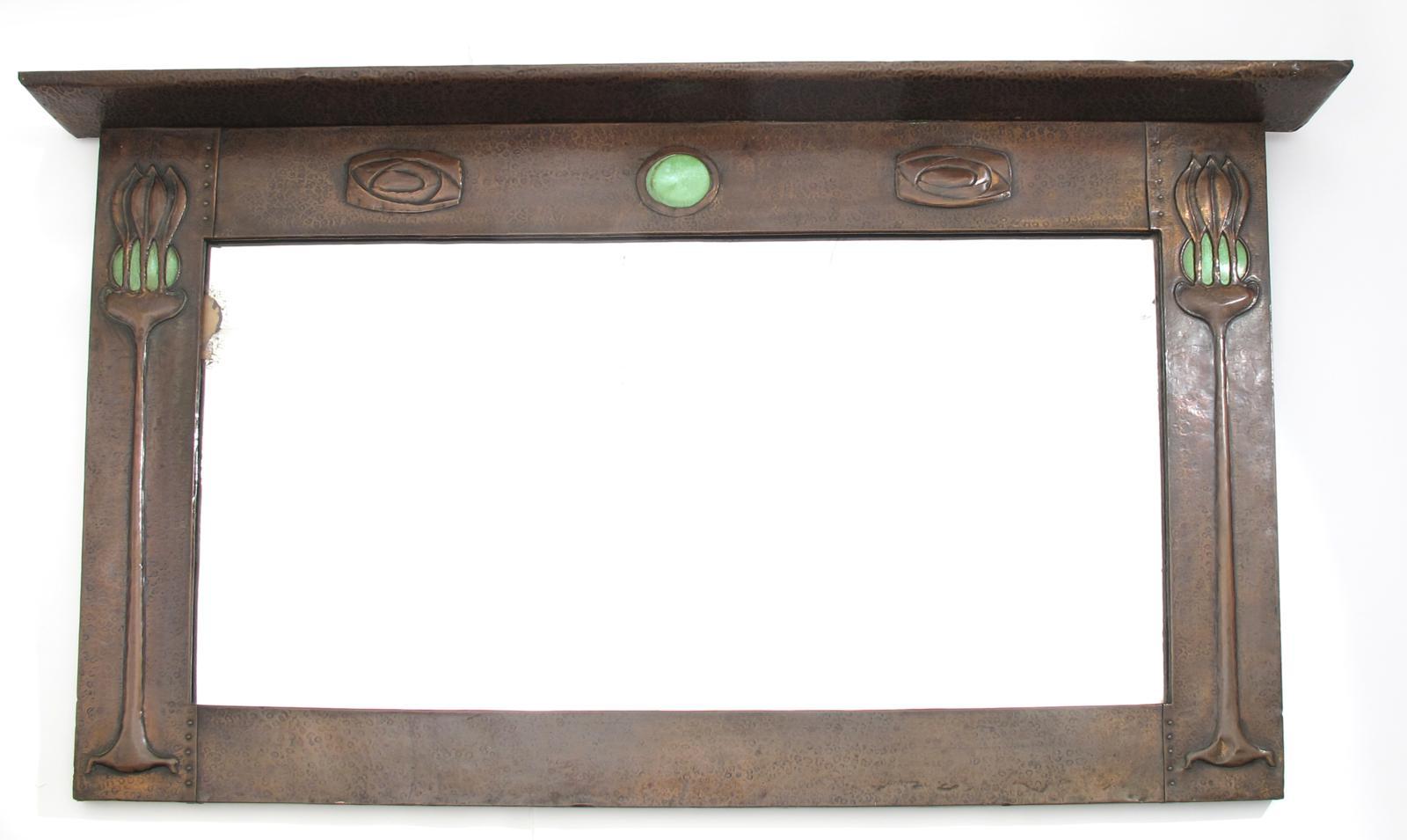 A large Glasgow School patinated copper wall mirror, rectangular with overhanging mantle, stamped in relief with Glasgow Rose and flower stems, set with green enamel roundels unsigned 114cm. wide, 74cm. high
