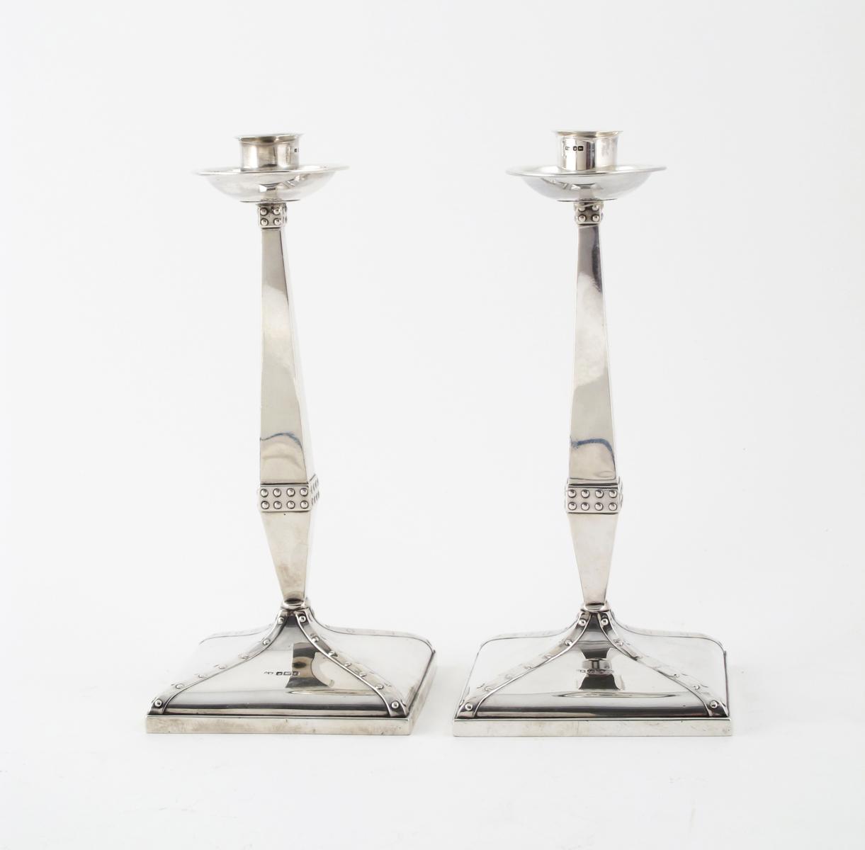 A pair of Henry Wilkinson silver candlesticks, after a design by James Dixon, tapering square section with circular sconce and drip pan, riveted decoration stamped marks Sheffield 1909 22.5cm. high