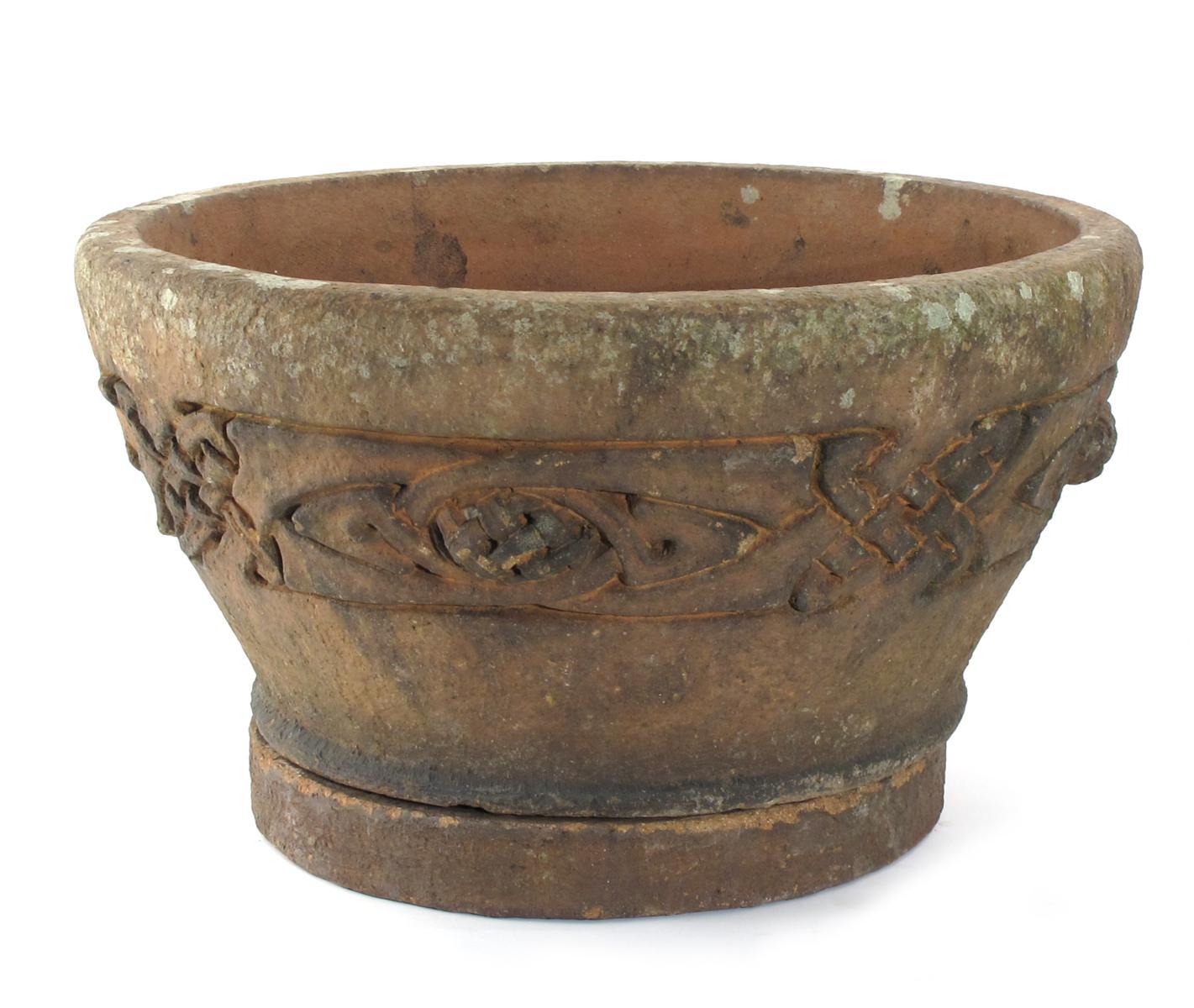 A Liberty & Co terracotta planter and stand, designed by Archibald Knox, probably made by Compton Pottery, cast in low relief with Celtic entrelac band impressed Liberty mark 56cm. diam.