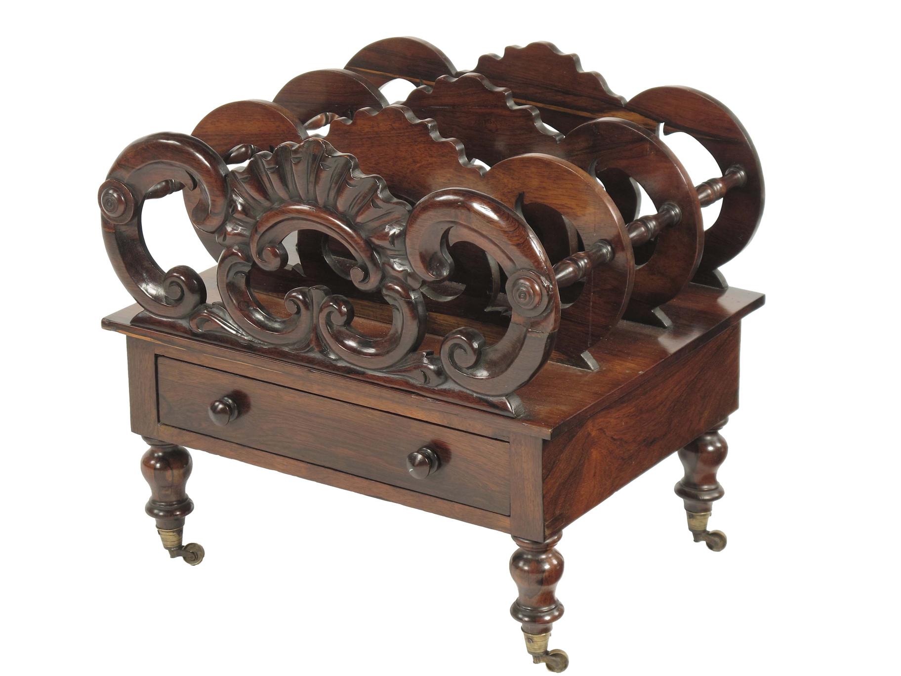 A Victorian rosewood Canterbury, with four shaped divisions the front carved scrolls and shells, with a frieze drawer and on brass castors, 19.25in (49cm) h, 20in (51cm) w, 15.75in (40cm) d.