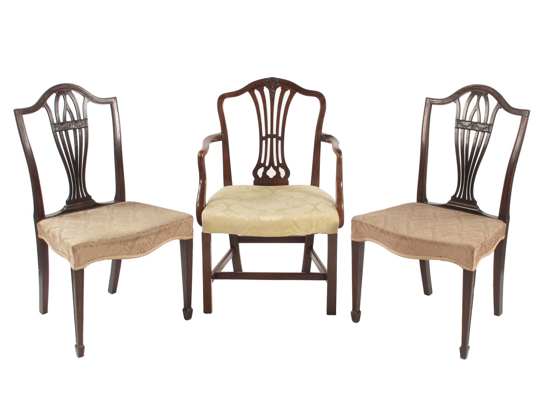 A pair of George III mahogany 'Hepplewhite' side chairs, each with an undulating top rail above a pierced splat with a carved tablet with husks and an oval patera, to a stuffed-over serpentine front seat on panelled square tapering legs to socket feet, together with a mahogany open armchair. (3)