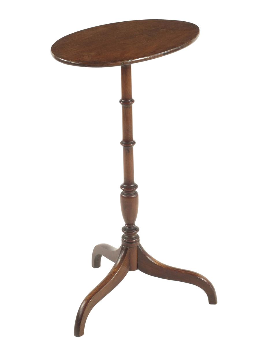 A mahogany tripod table, the top and base associated, 28in (71cm) h, 18.25in (46.5cm) w, 12in (30.5cm) d the top.