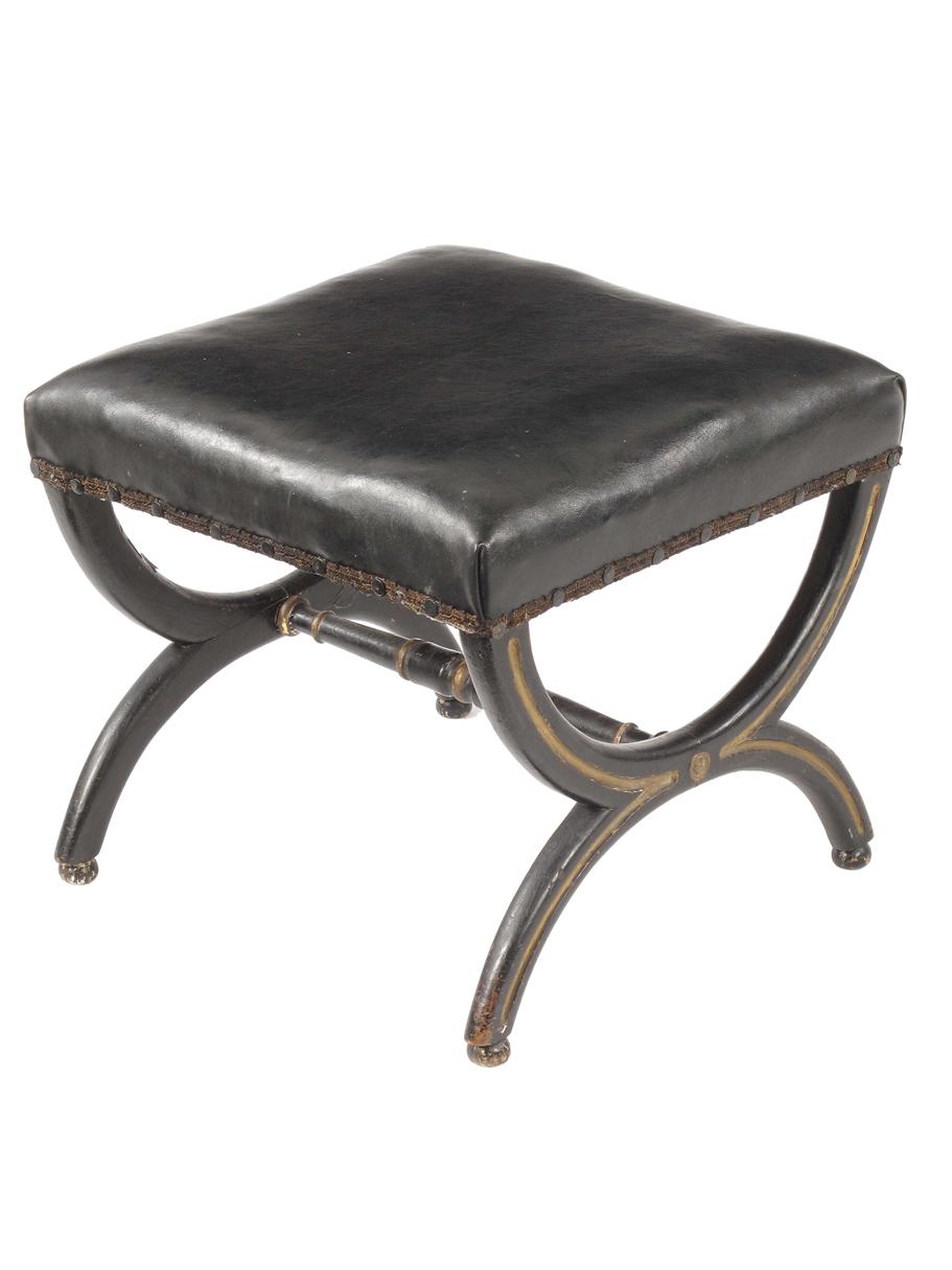 A William IV ebonised and parcel gilt 'X' frame stool, with a later leatherette covered top, 17.5in (44.5cm) h, 19in (48cm) sq.