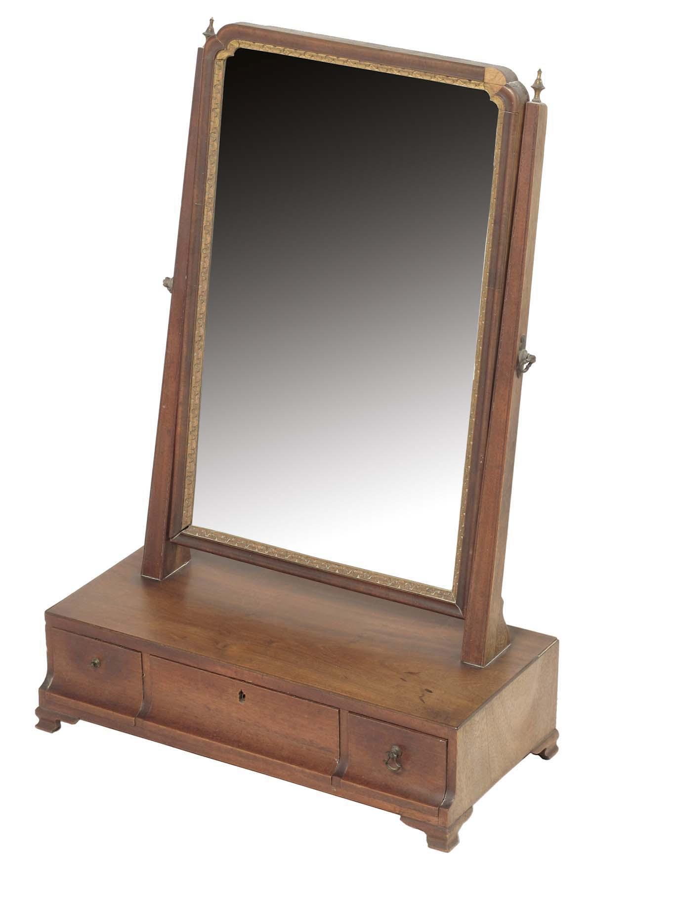 A George III style mahogany dressing table mirror, the arched plate to a giltwood slip, the box base fitted three drawers, on ogee bracket feet, 19th century, 23.75in (60.2cm) h, 16.25in (41.2cm) w.