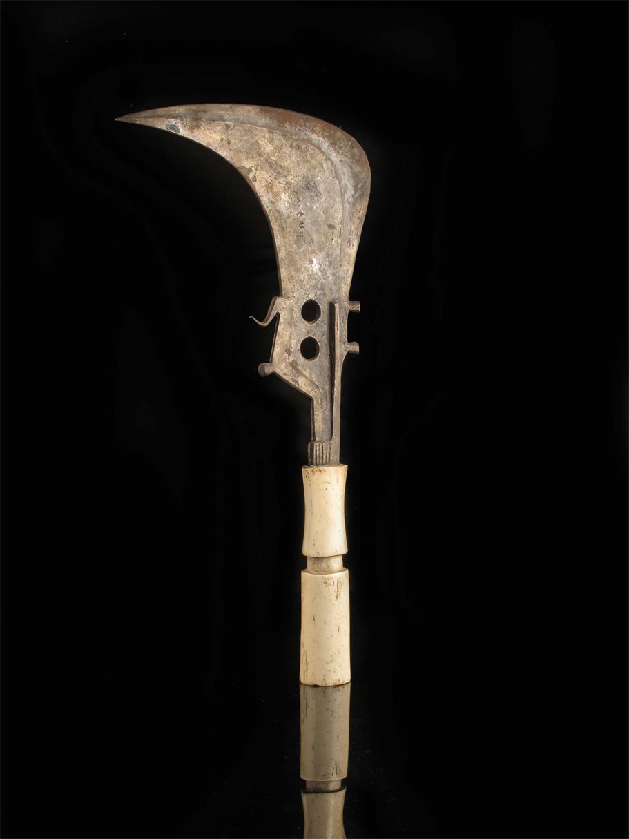 A Mangbetu ceremonial knife, with a curved iron blade having two circular piercings and four projections, one curved, and a ribbed section, with a waisted ivory handle, 14.75in (37.5cm) l.
