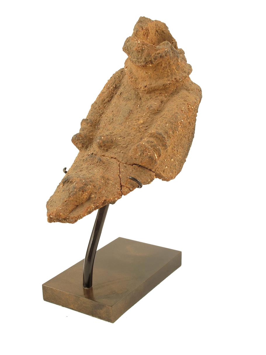 A Nok fragmentary pottery male figure, 500BC - 500AD, with relief arms and genitals, 6in (15cm) h, 9in (23cm) l, on a later stand. (2)