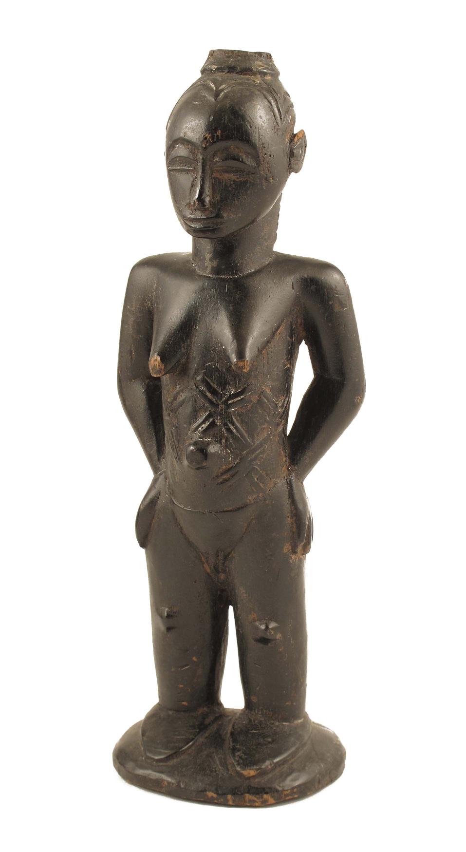 A Guro standing female figure, her head with shaped fringe coiffure and an oval mound, relief scarification to abdomen and hands resting on hips, 12.75in (32.5cm) h.
