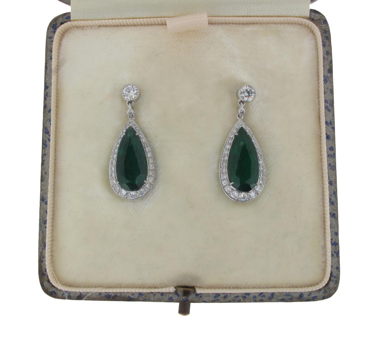 A pair of emerald and diamond drop earrings, the two pear shaped emeralds weigh approximately 6.30cts in total and are set within borders of graduated circular cut diamonds and suspend from a larger diamond, set in white gold. 3cm high.
