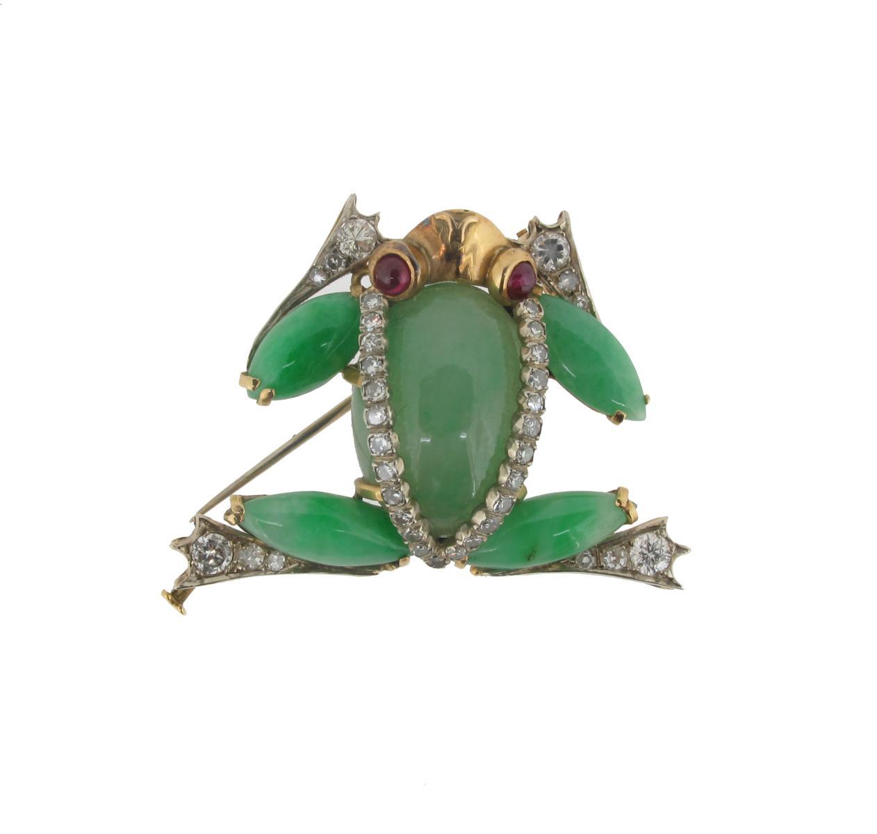 A jade, diamond and ruby set gold frog brooch, realistically formed with ruby eyes. 4cm wide.