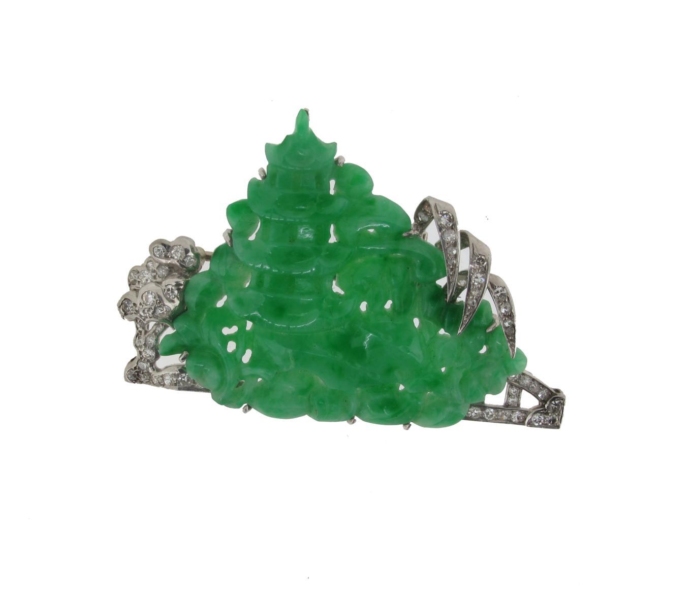 A jade and diamond brooch, the pierced jade section carved as a pagoda amongst foliage with diamonds set to the white gold mount. 5cm wide.