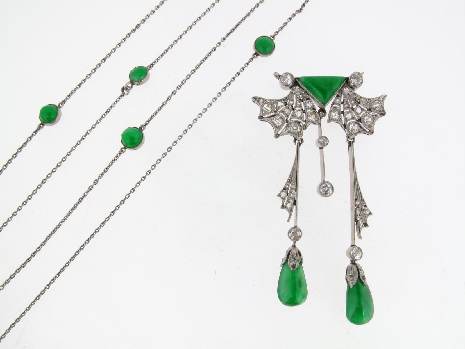 An early 20th Century open work web form pendant, set with three jade sections and old cut diamonds in white gold. Suspended from a fine link platinum neck chain mounted with seven jade cabochons.