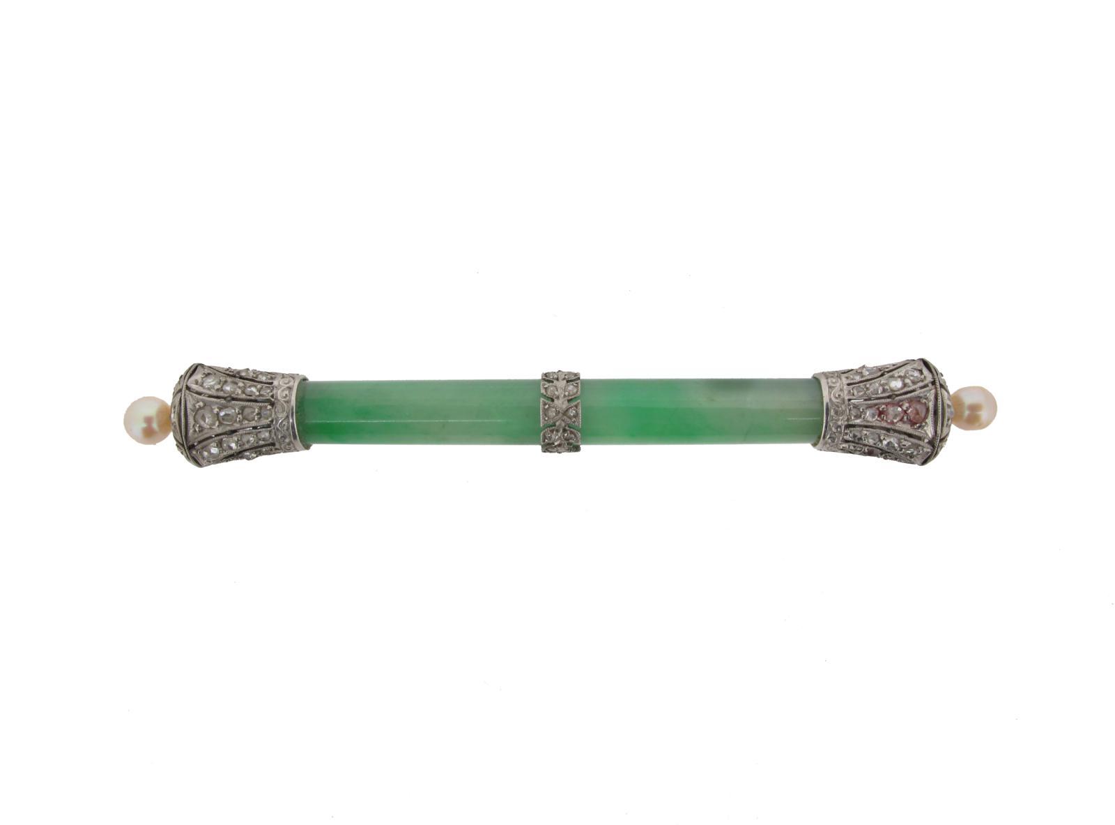A jade cylinder bar brooch, with rose cut diamond set pierced terminals with pearls and a central band of foliate mounted rose cut diamonds. 7.2cm wide.