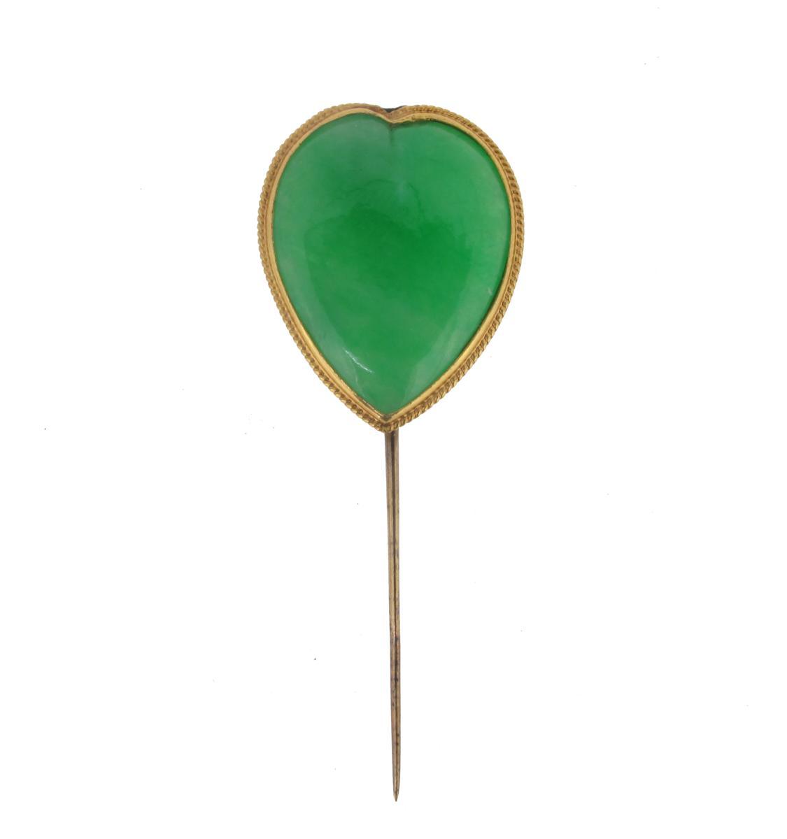 A gold mounted heart shaped jade pin.