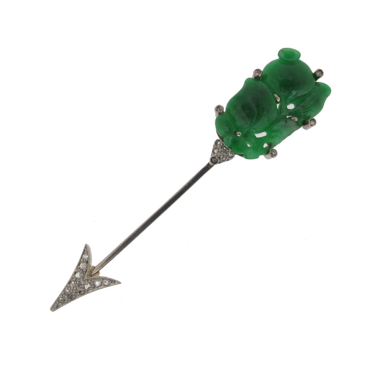 A French diamond and jade arrow form jabot pin