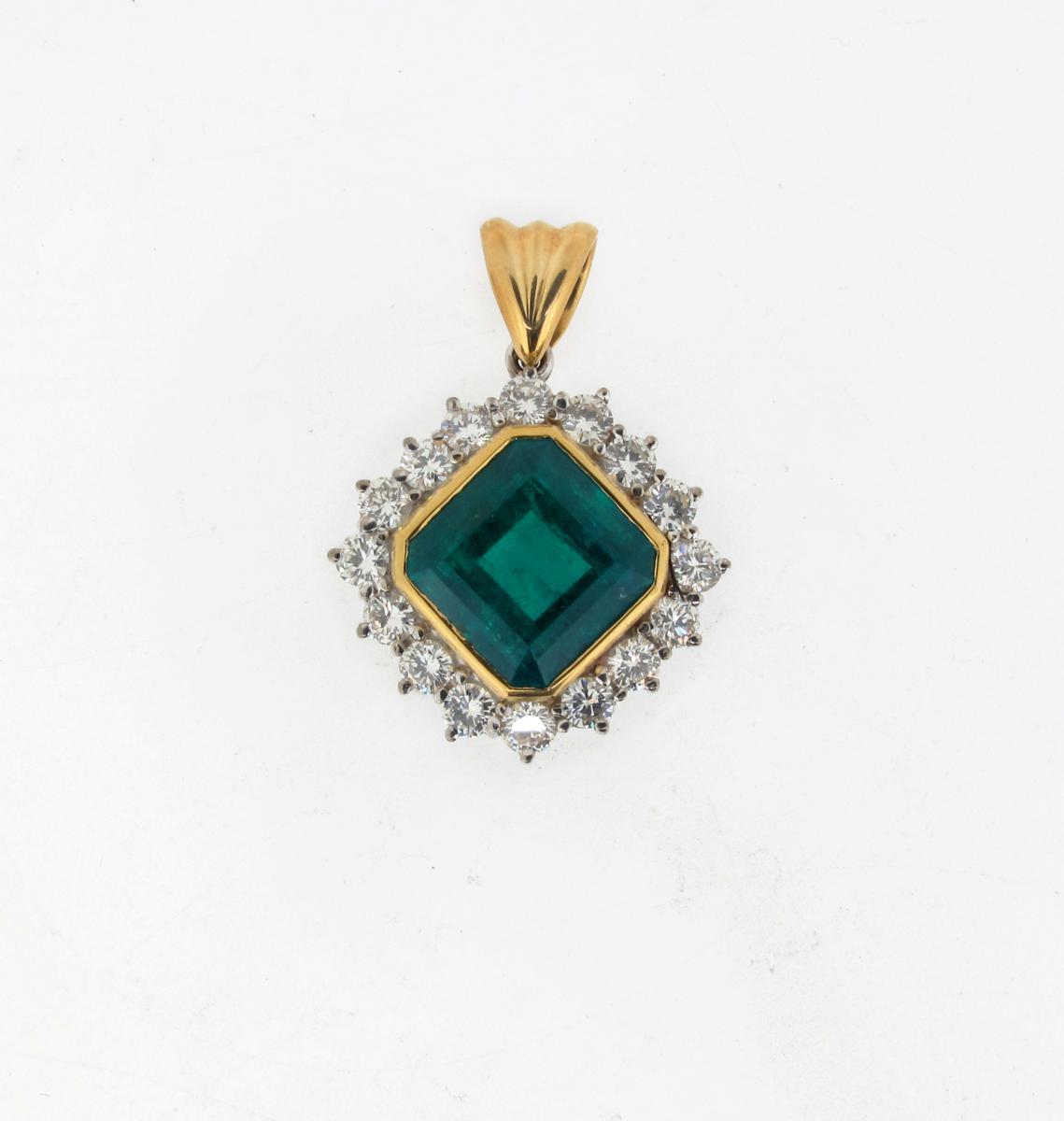 An emerald and diamond pendant, the emerald cut emerald weighs approximately 5.30cts and is rub-over set in yellow gold within a border of sixteen round brilliant cut diamonds.