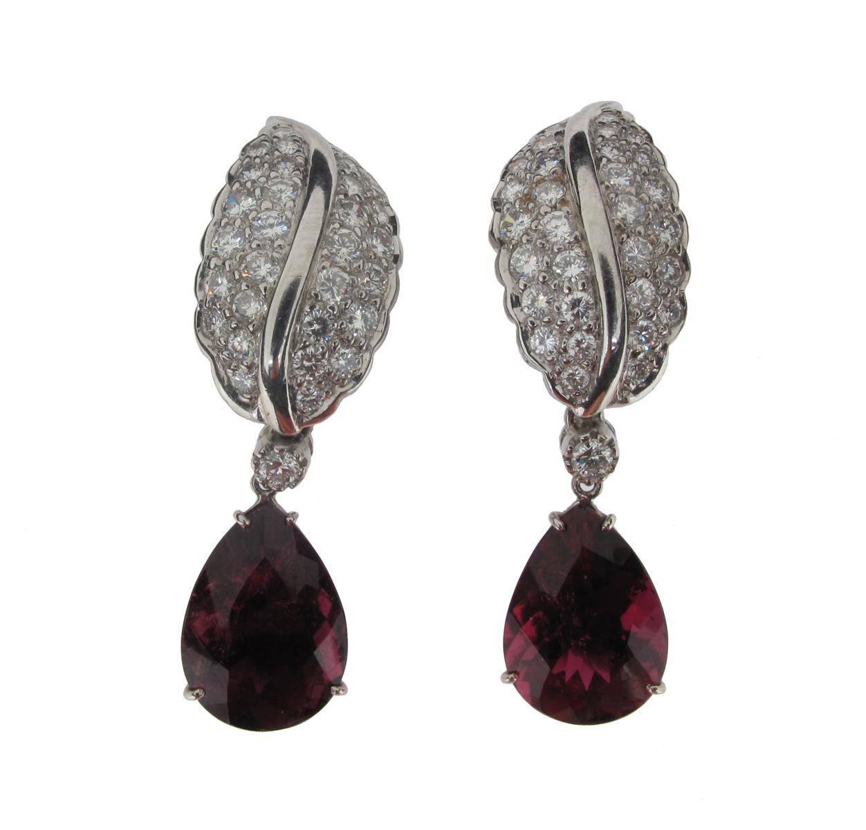 A pair of diamond and rubelite drop earrings, the pear shaped tourmalines suspend from a single diamond and a white gold leaf pave set with further circular cut diamonds. 5cm high.