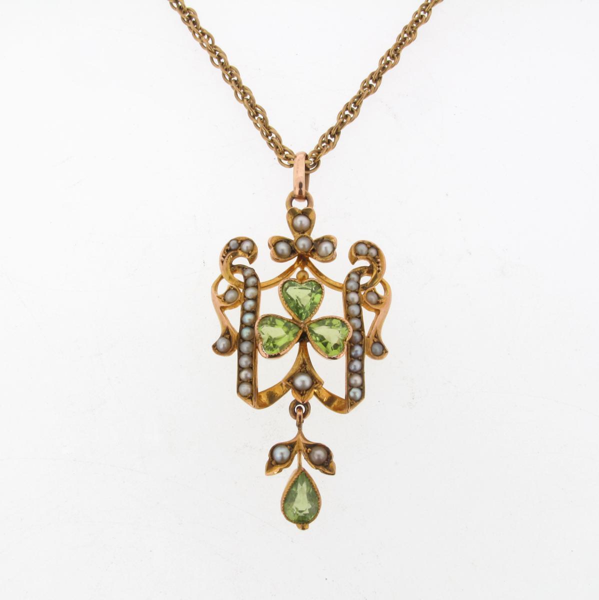An Edwardian peridot and seed pearl set gold pendant, the centre stylised shamrock is set with three heart shaped peridots within the seed pearl set gold frame and suspending a further pear shaped peridot with gold chain.