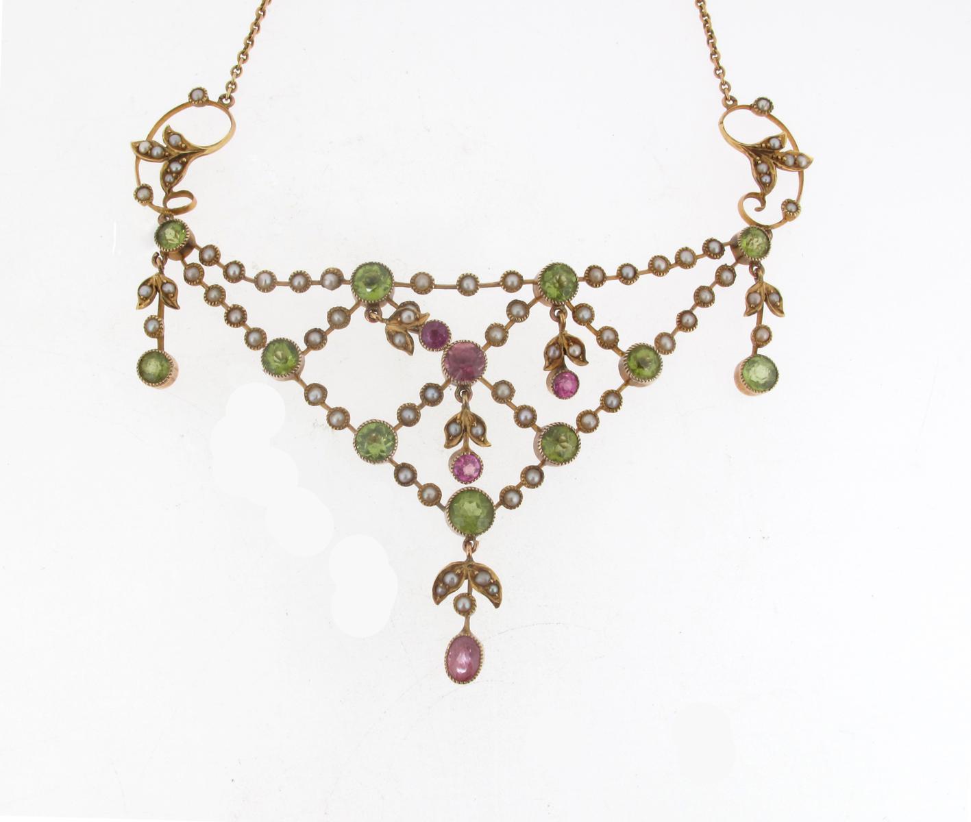 An Edwardian lattice form gold necklace, set with pink topaz, peridots and seed pearls. Fine link gold neck chain.