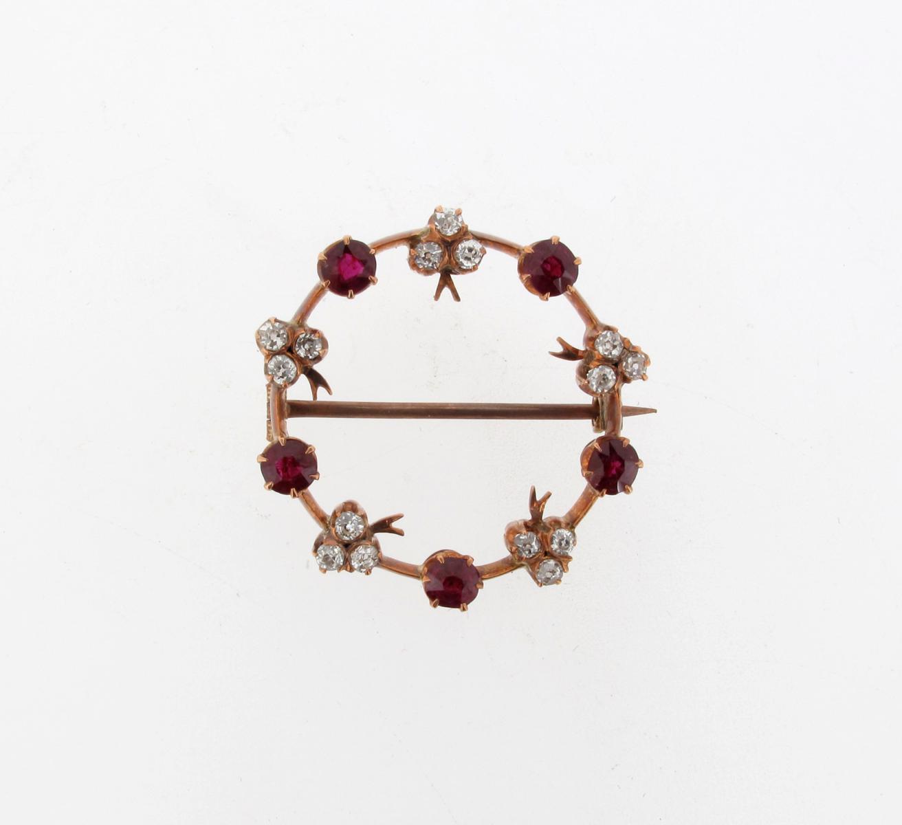 A ruby and diamond set gold circle brooch