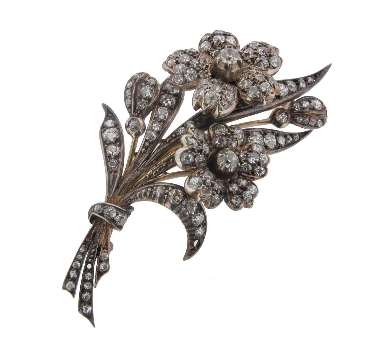 A Victorian foliate brooch set with diamonds, with two flower heads and tied at the stems and set in silver and gold. 6cm high.