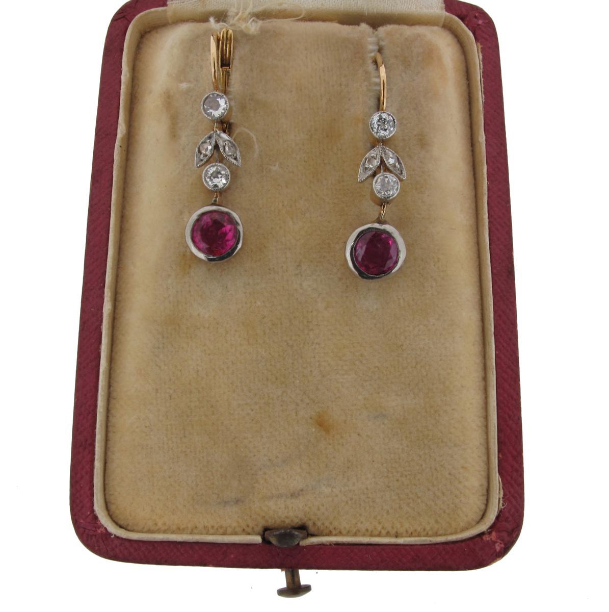 A pair of ruby and diamond drop earrings, set in platinum and gold. Cased.