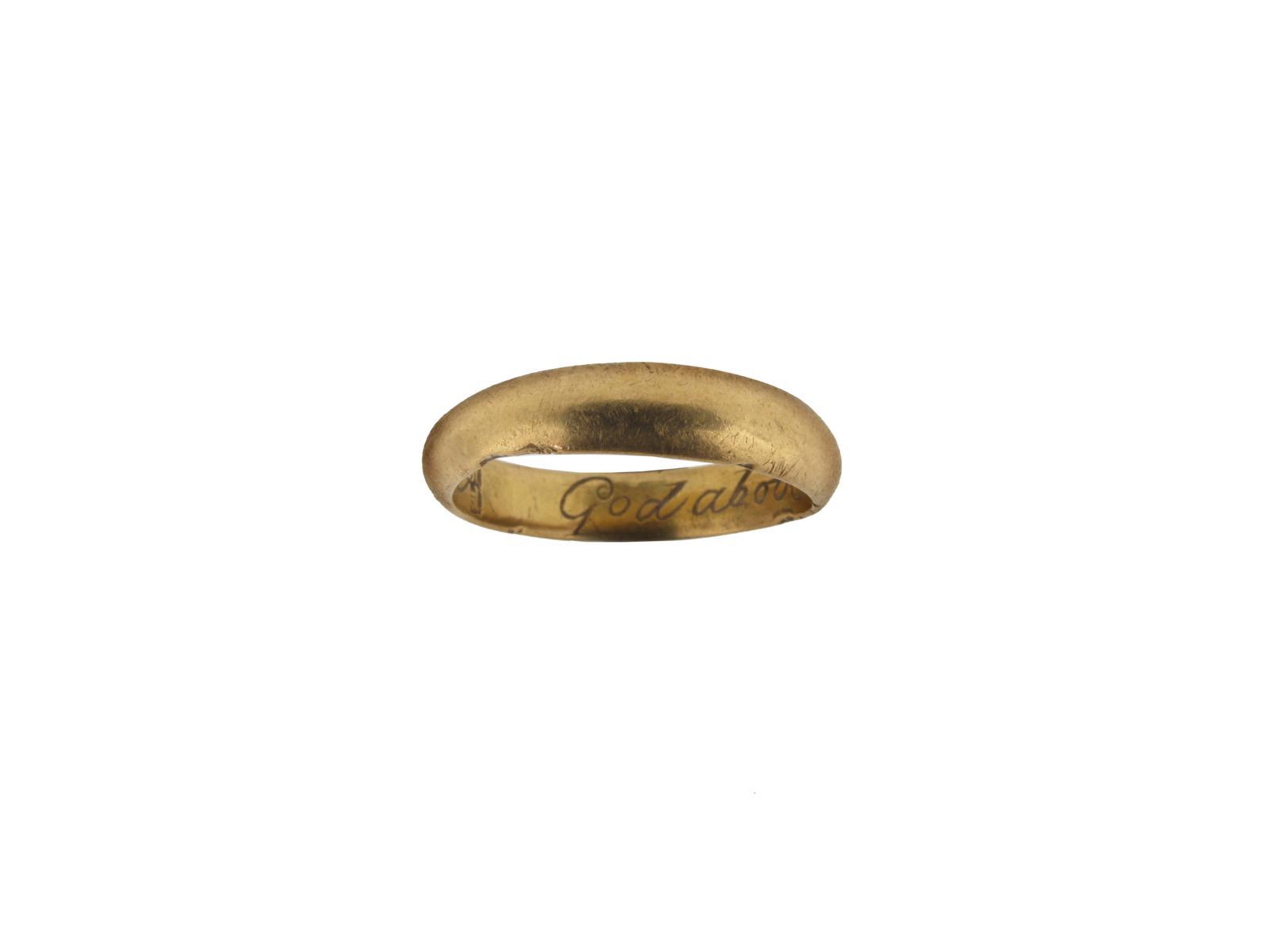 A gold posy ring, engraved to the interior 'God above increase our love' 5g. Size N.