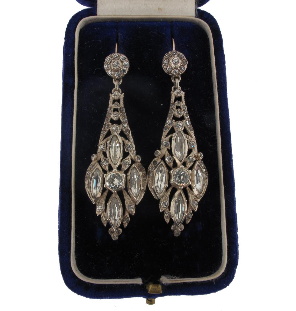 A pair of white paste set silver drop earrings, fitted box by Mrs Newman.