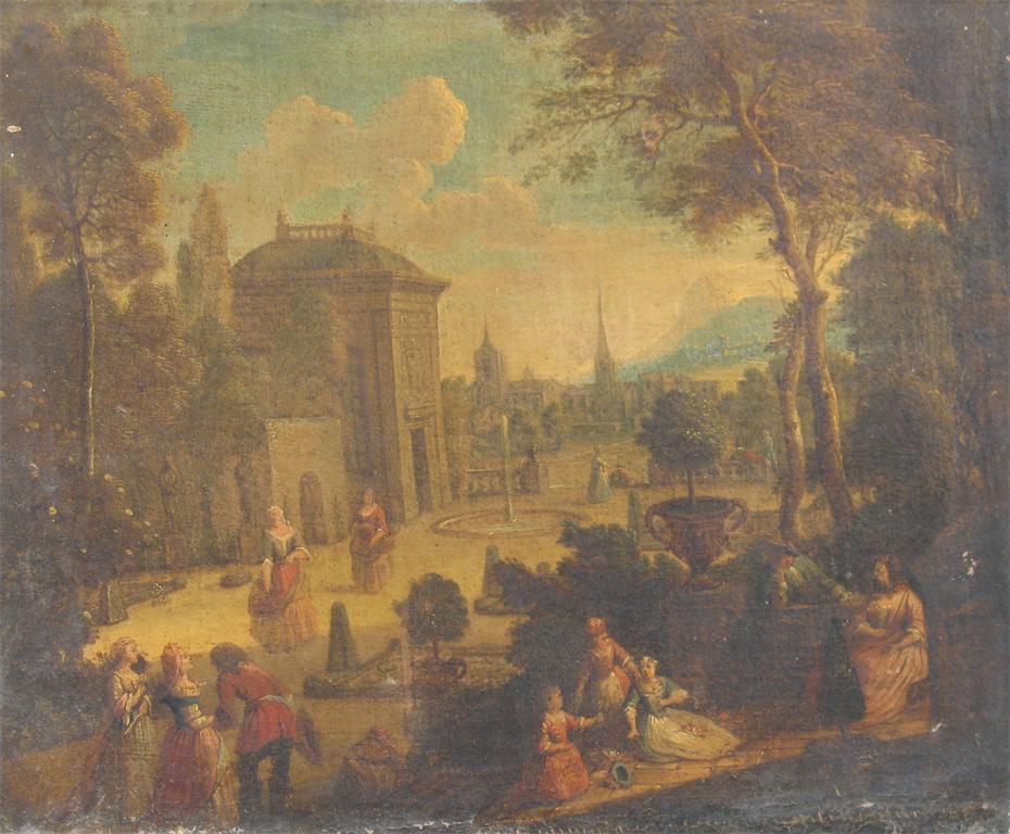 FRENCH SCHOOL (c.1800): Figures in a courtyard with buildings beyond