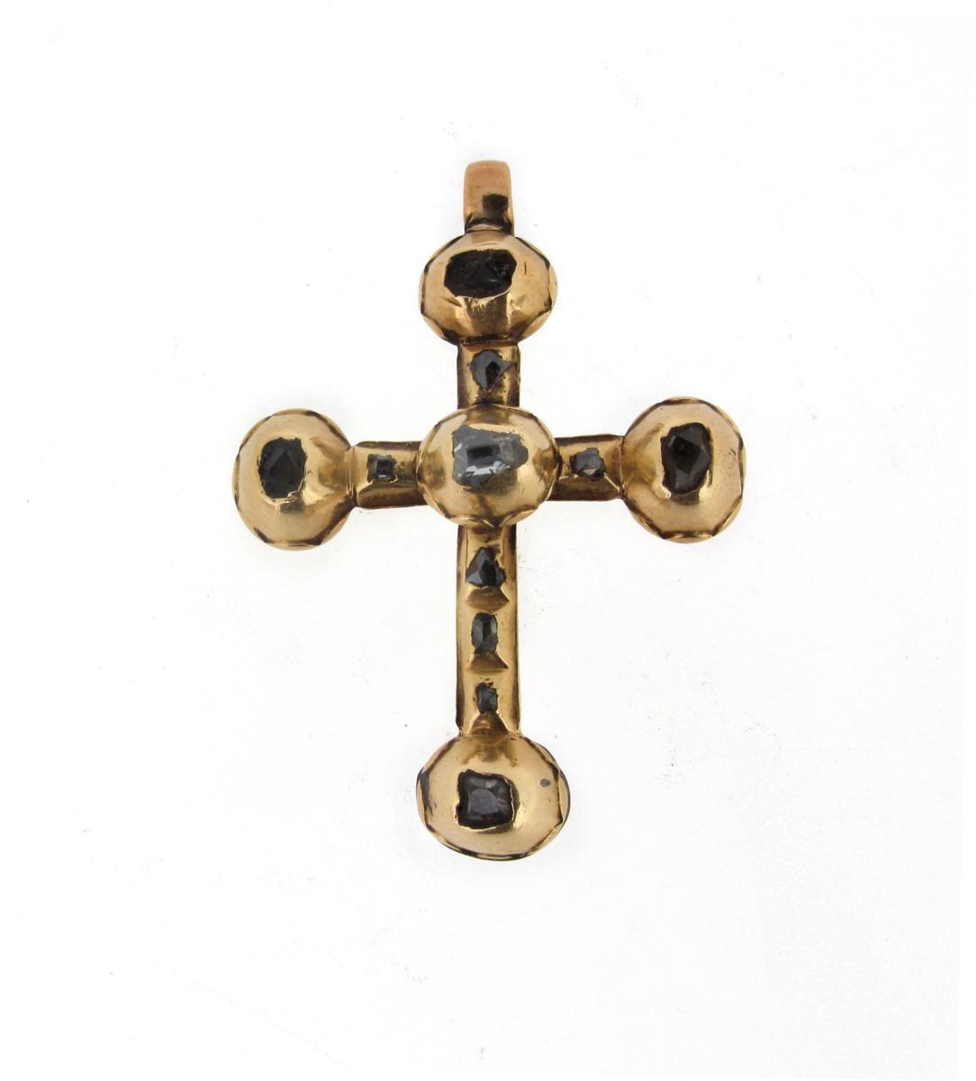A Renaissance style gold cruciform pendant set with diamonds and dark coloured stones. 3.6cm high.