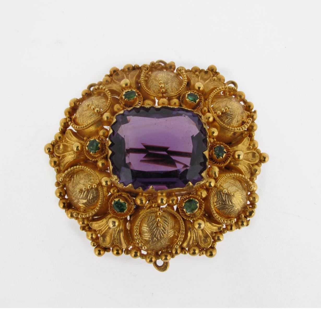 An early 19th Century amethyst set gold brooch, the cushion shaped amethyst is set in an ornate mount with small emeralds. 4.5cm wide.