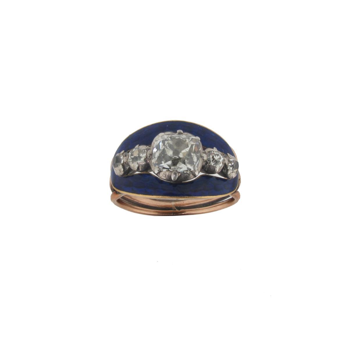 A George III diamond set half hoop ring, the five graduated cushion shaped diamonds are set in silver colets on a blue guilloche enamel oval shaped ground. Gold shank. Size L.