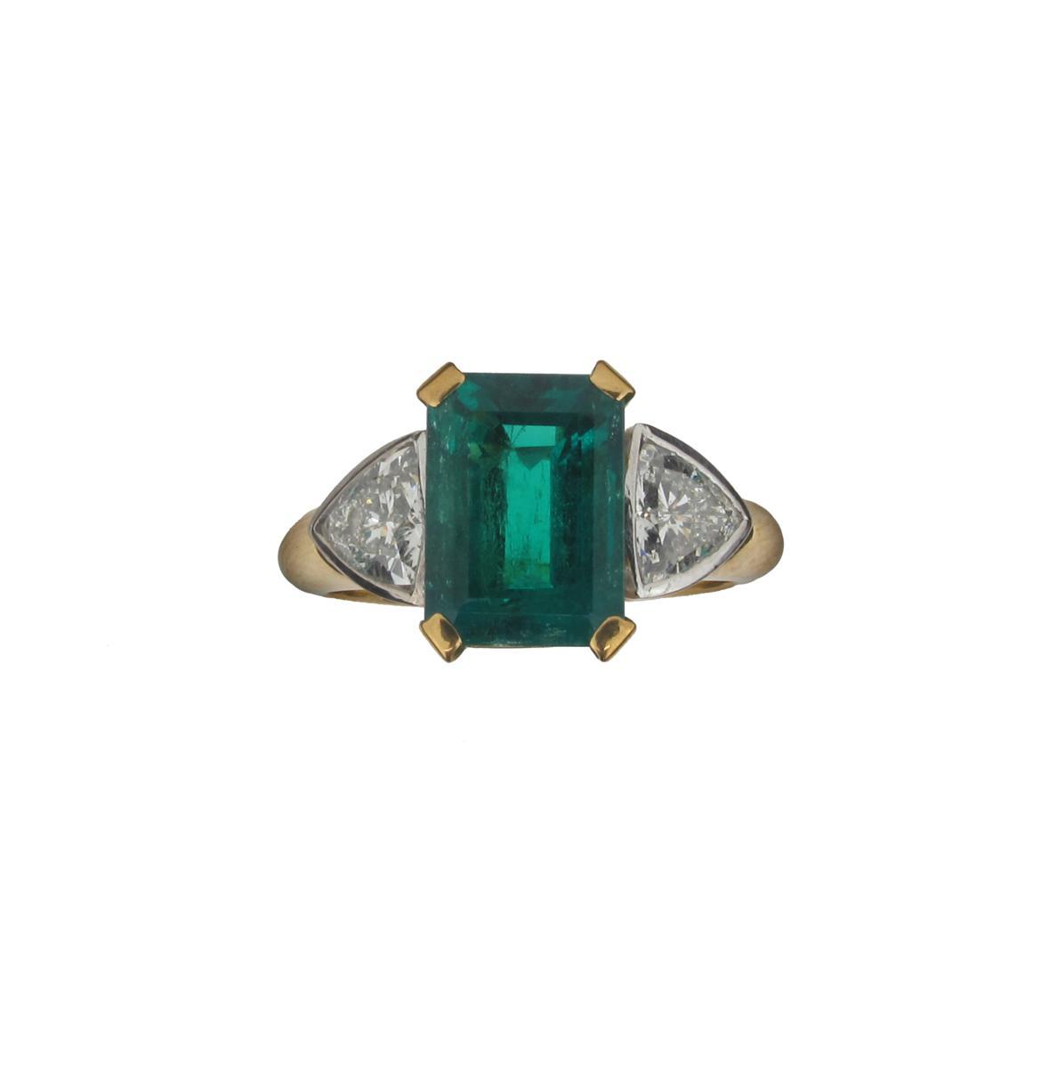 An emerald and diamond set three stone ring, the octagonal cut emerald weighs approximately 3.20cts and is set with two trillion cut shoulder diamonds in 18ct yellow and white gold. Size S.