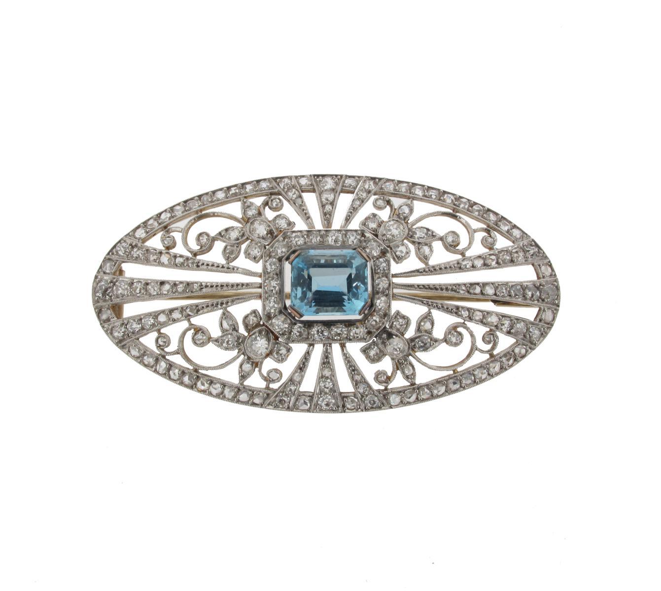 An aquamarine and diamond brooch, centred with an emerald cut aquamarine within a diamond border and millegrain set with open foliate scroll decoration set with further diamonds. 5.8cm wide.