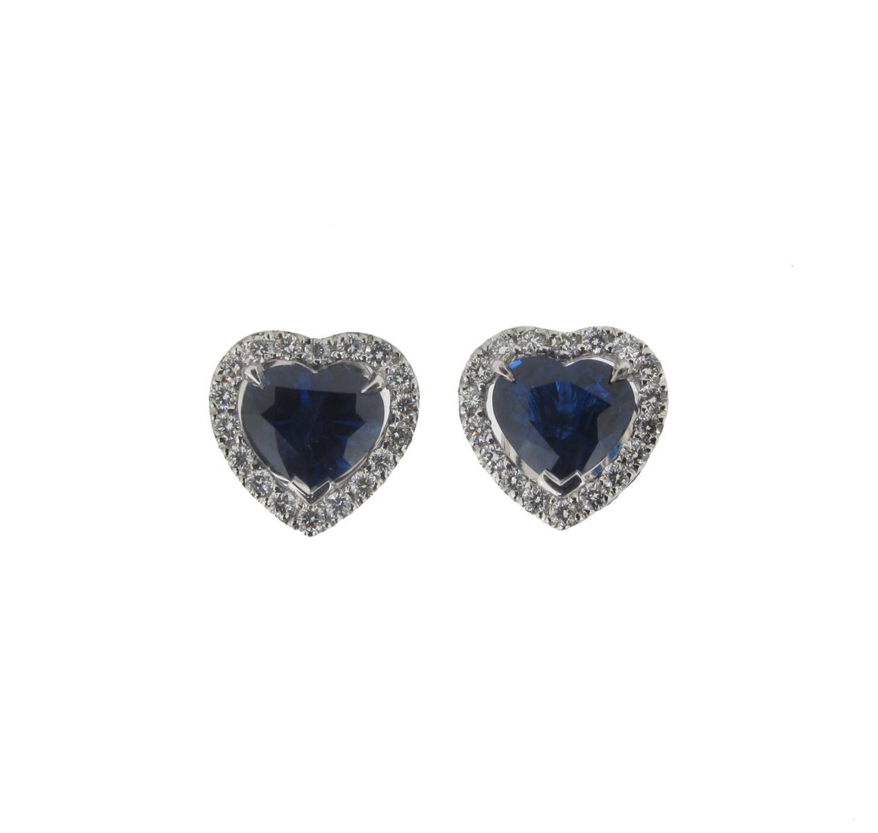 A pair of sapphire and diamond ear studs, the heart shaped sapphires are each set within a surround of circular brilliant cut diamonds in white gold.